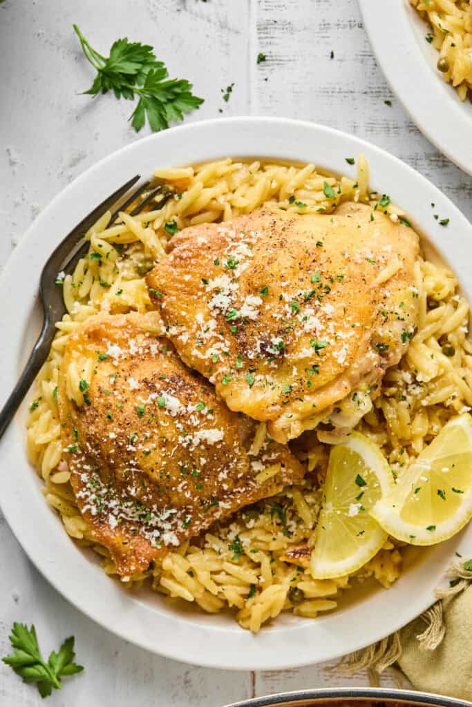 - Nestle chicken thighs into orzo and transfer to oven. Bake for 18-20 minutes or until thighs read 165F.