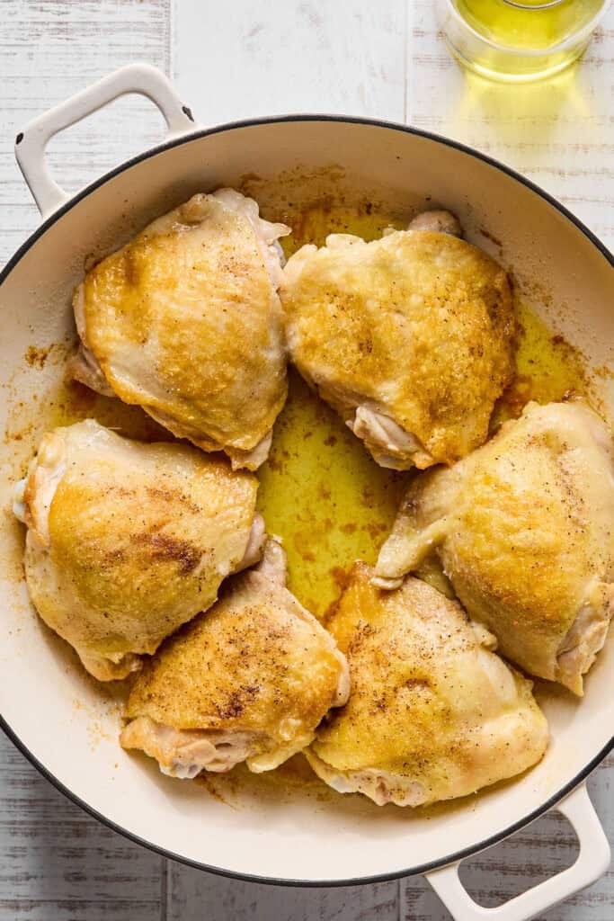 Start by heating your oven and seasoning the chicken thighs really well with salt and pepper. Sear them skin-side down in a hot, oven-safe skillet until golden and crispy, then flip and cook a few minutes more before setting them aside. Don’t worry about the browned bits left behind, that’s where all the flavor is!