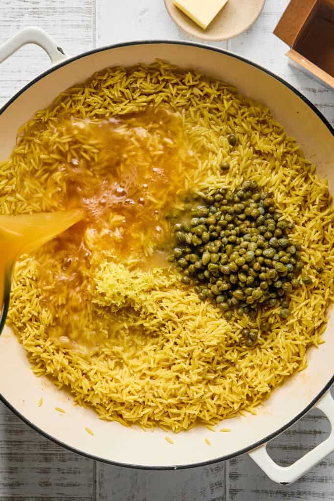 - Once toasted, add capers and the caper juice from the jar, lemon juice, lemon zest, wine and broth. Cover and cook for 10-12 minutes or until orzo is al dente, stirring every few minutes.