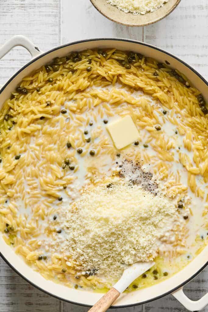 - Once orzo is cooked, stir in remaining butter, milk, pecorino romano, salt, and pepper. Let simmer for 6-8 minutes or until most of the moisture has been absorbed.